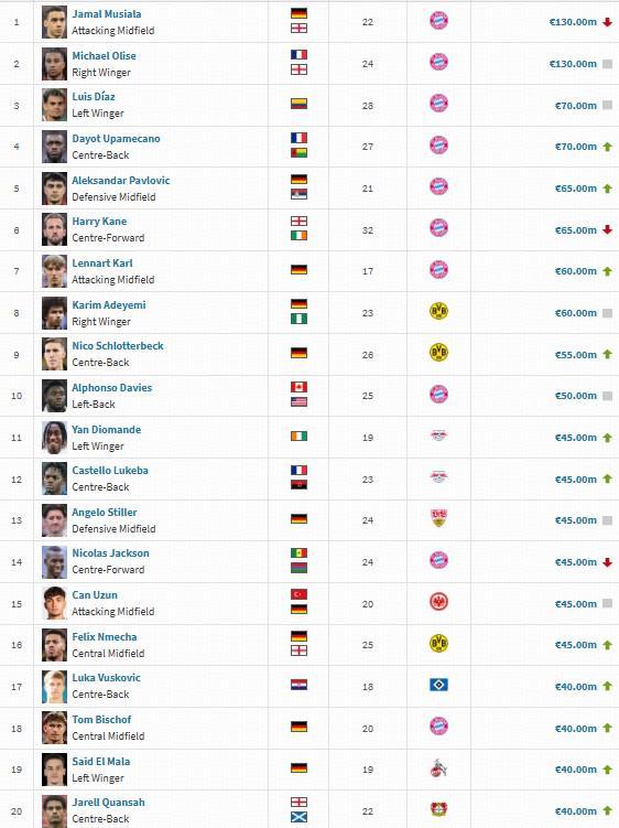 在本次身價(jià)更新中,穆西亞拉身價(jià)下跌1000萬歐至1.3億歐,與奧利塞并列第一,于帕梅卡諾身價(jià)上漲1000萬歐至7000萬歐與迪亞斯并列第三,凱恩身價(jià)下跌1000萬至6500萬歐,與帕夫洛維奇并列第五,卡爾身價(jià)上漲4000萬歐至6000萬歐。